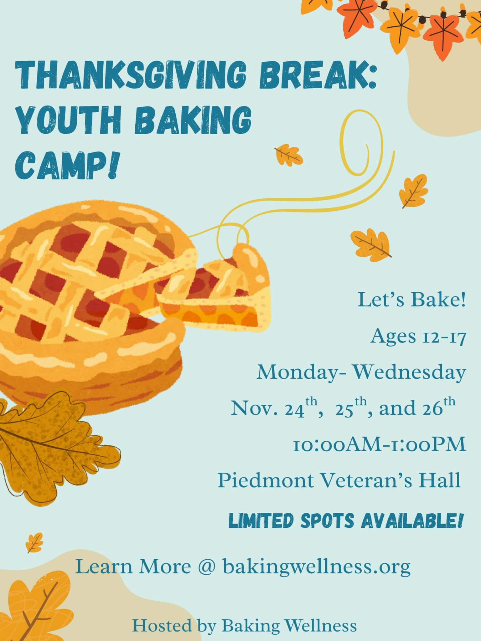 Need something to do over Thanksgiving break? Baking Wellness is offering a 3-day baking camp for youth ages 12-17! Participants will work with a variety of recipes that expose them to various baking techniques– from pies to yeasted doughs, to quick breads and savory bakes- helping them build a solid foundation in the kitchen while also connecting with themselves and others.