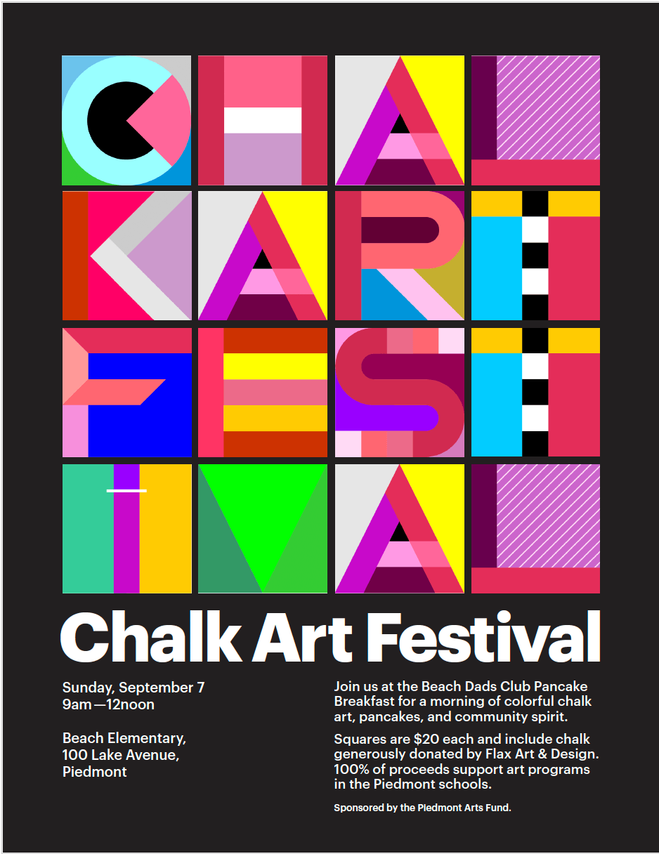 Join the Piedmont Arts Fund for a morning of colorful chalk art, pancakes (cooked up by the Beach Dad’s Club), and community spirit at Beach Elementary School. Chalk squares are $20 dollars each and come with a colorful box of chalk, generously donated by Flax Art & Design.100% of net proceeds go to art programs in the Piedmont schools. The Chalk Art Festival is a colorful way to start off fall, draw some chalk art on the blacktop, and directly support the outstanding arts programs in our schools.